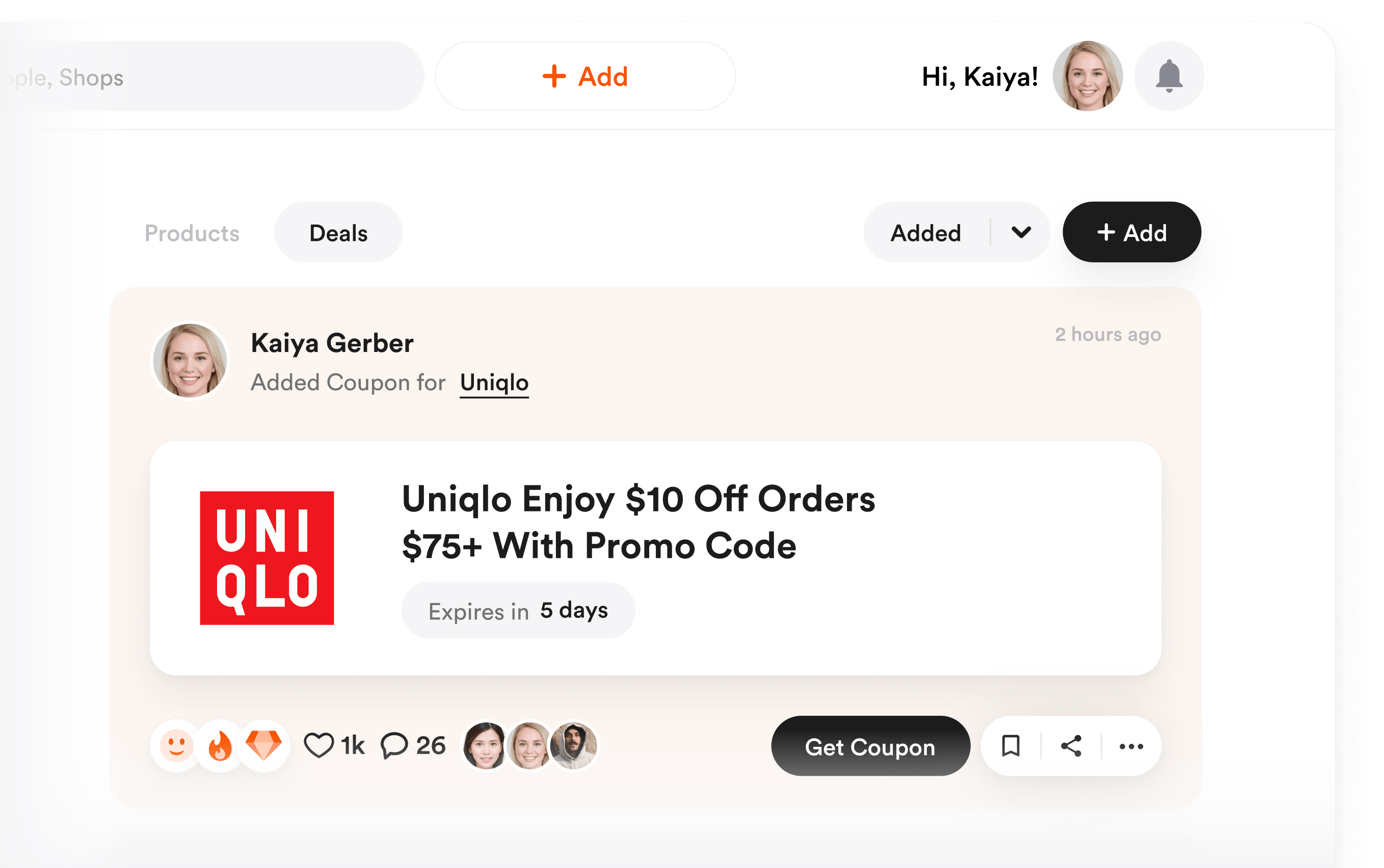 Influencers often collaborate with brands, promoting their offers. Thus, I placed deals and coupons on a same page, so fans save time and efforts discovering them.