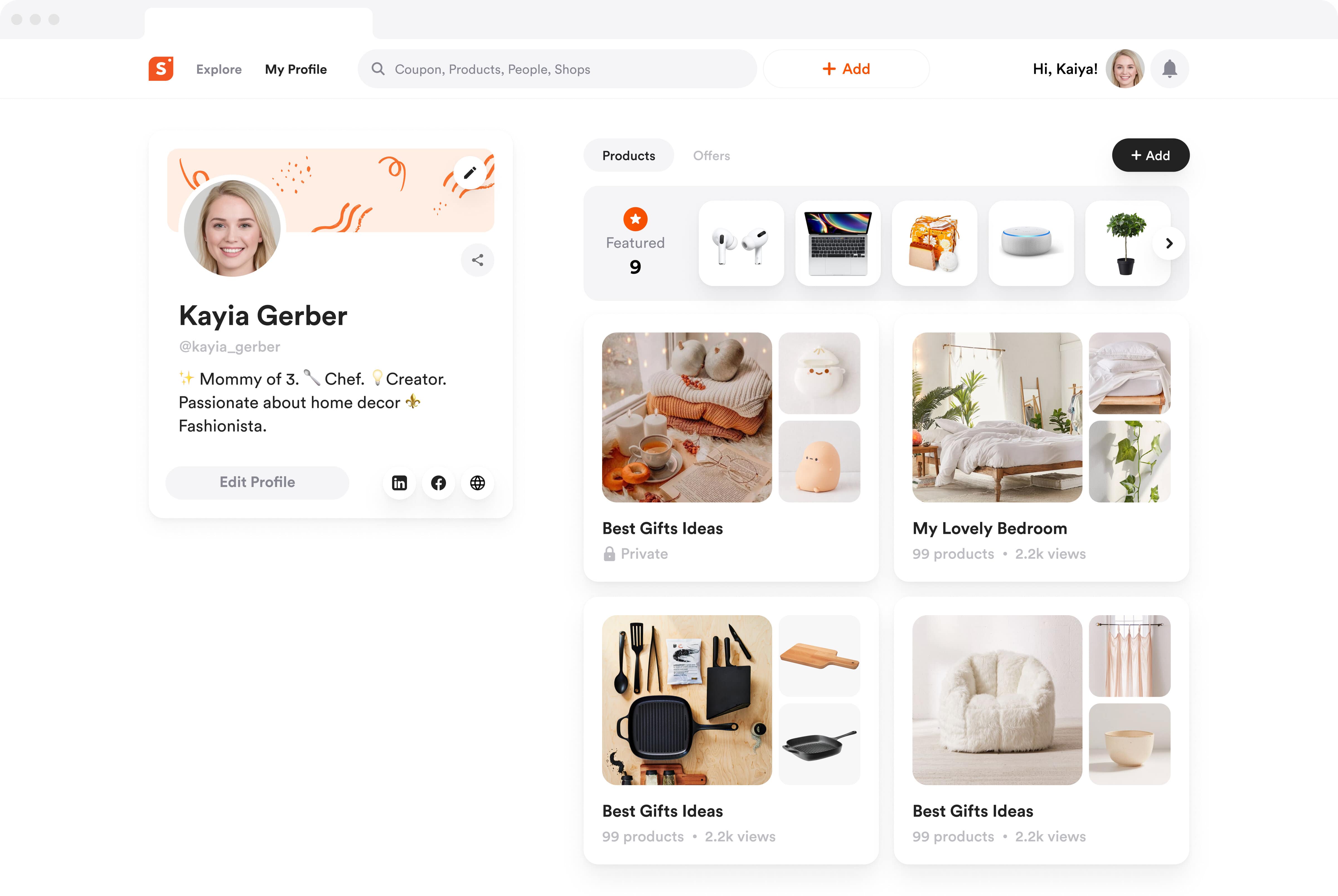 Neatly gathers all products, coupons, deals, and expresses the creators’ personality. Neatly gathers all products, coupons, deals, and expresses creators’ personality.